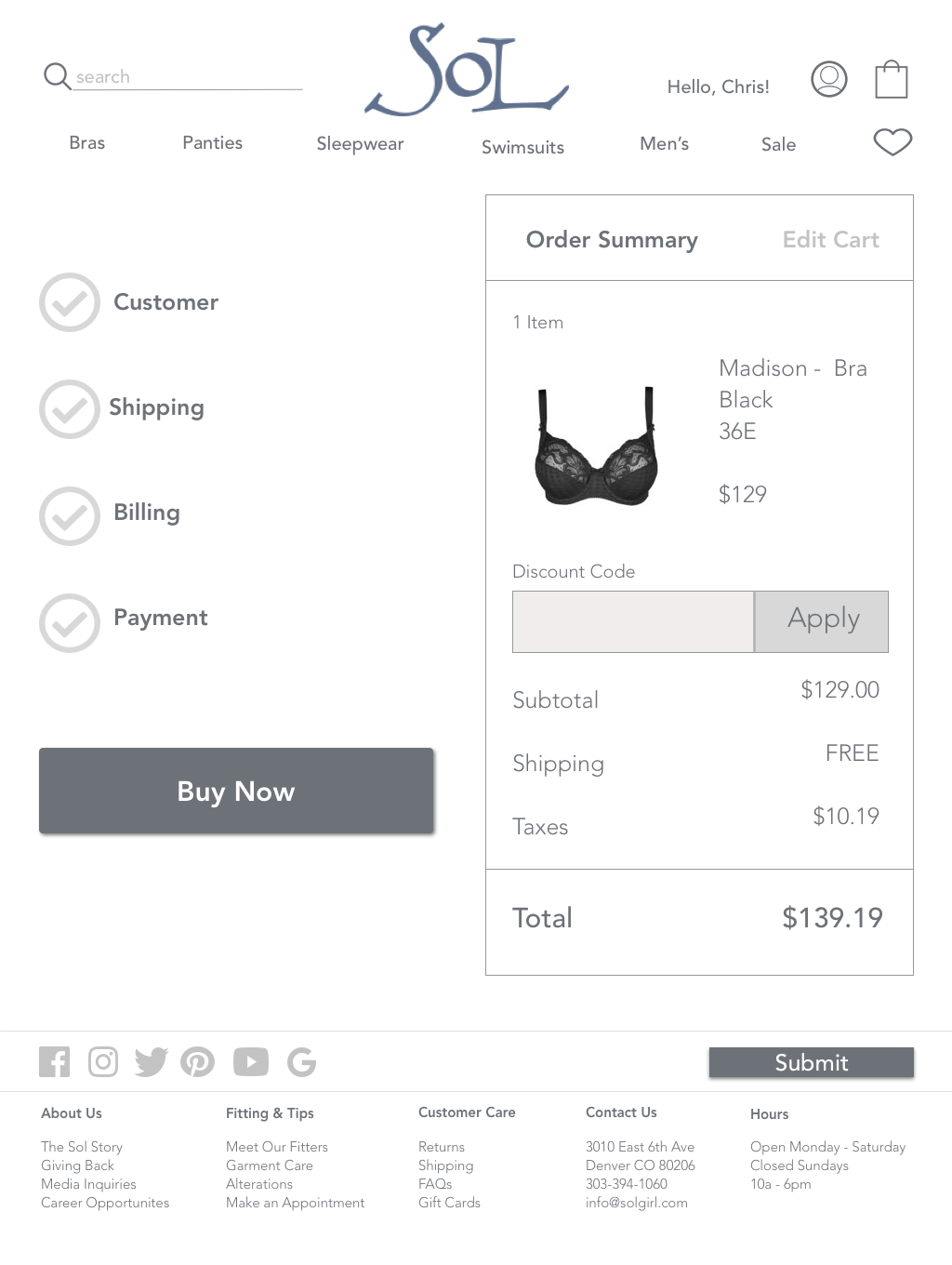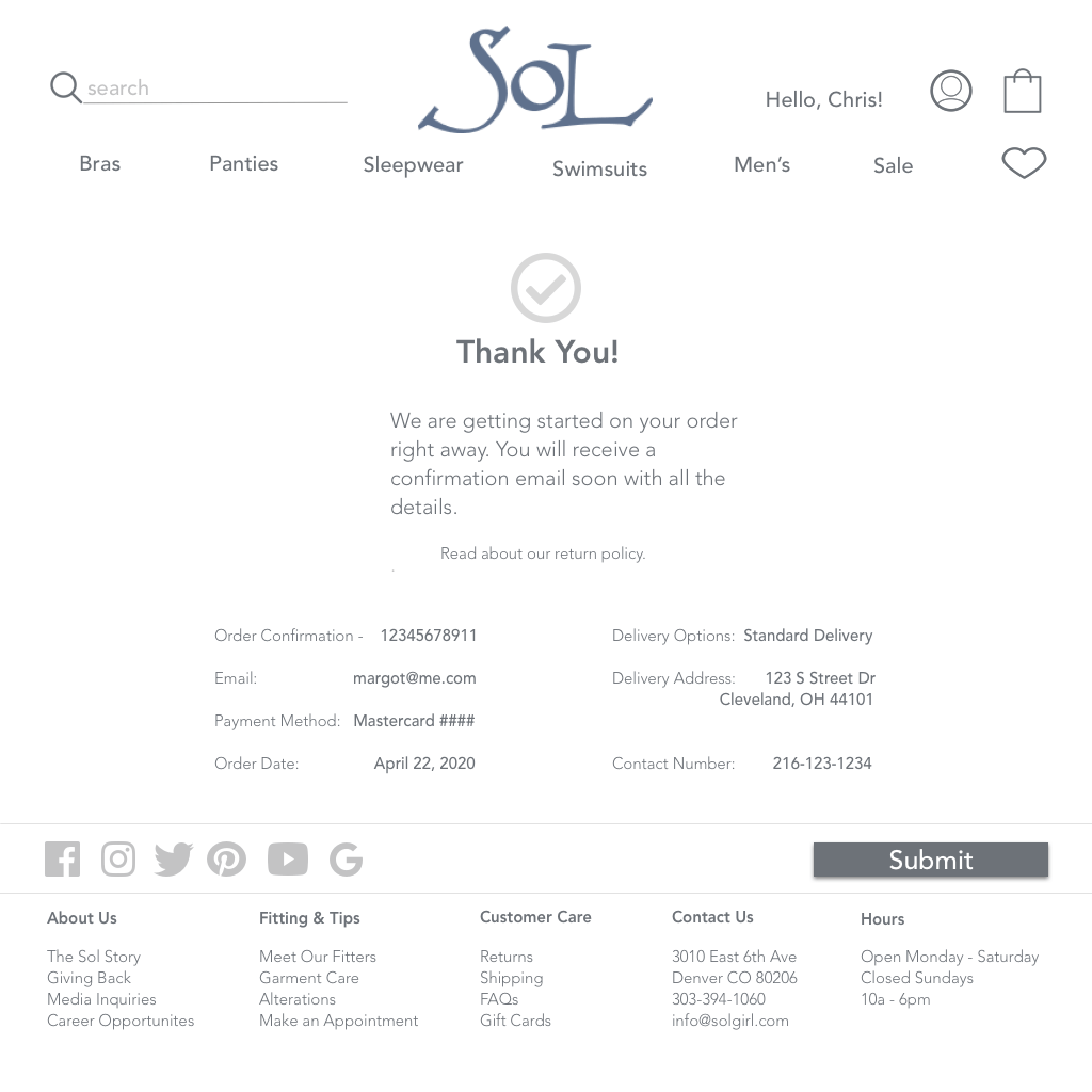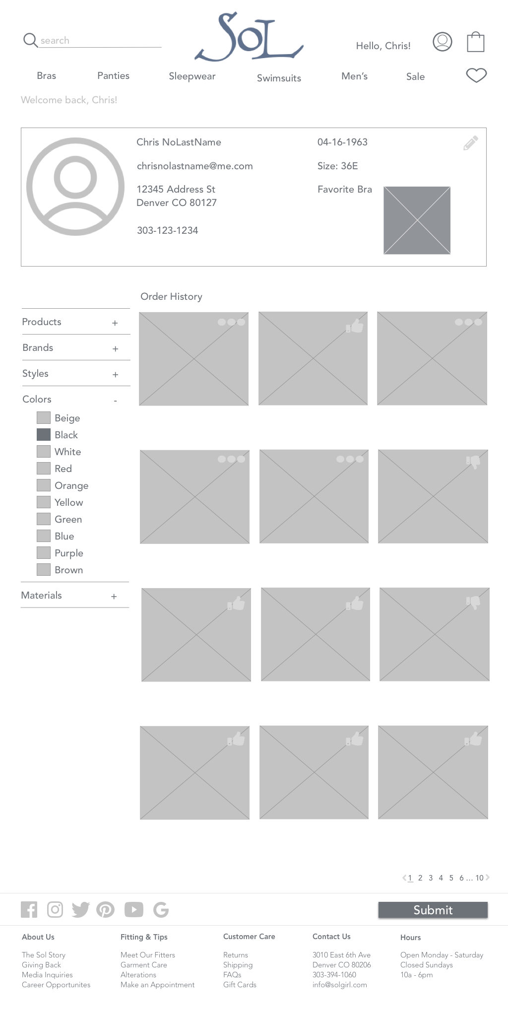 - By adding a customer profile to the Sol website, we can add features such as order history, bra size, update address and current payment methods to help ensure that Chris can order the correct products in the correct sizes in a timely and efficient matter.