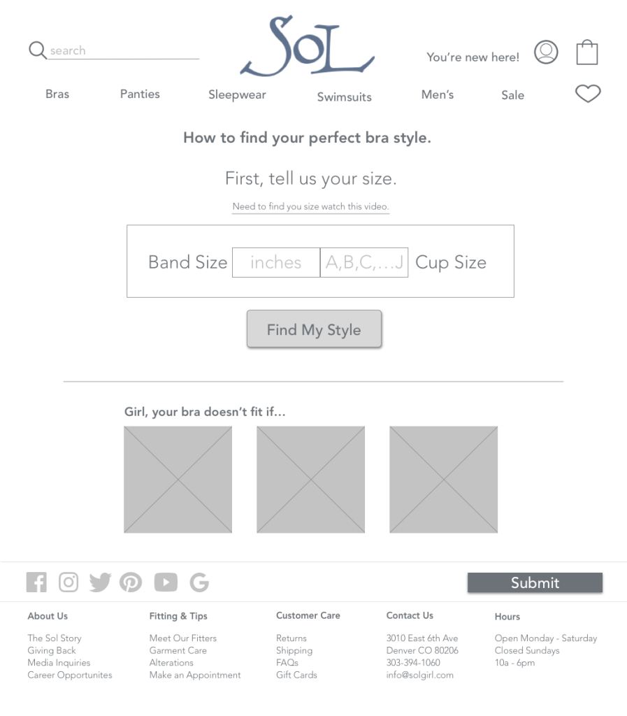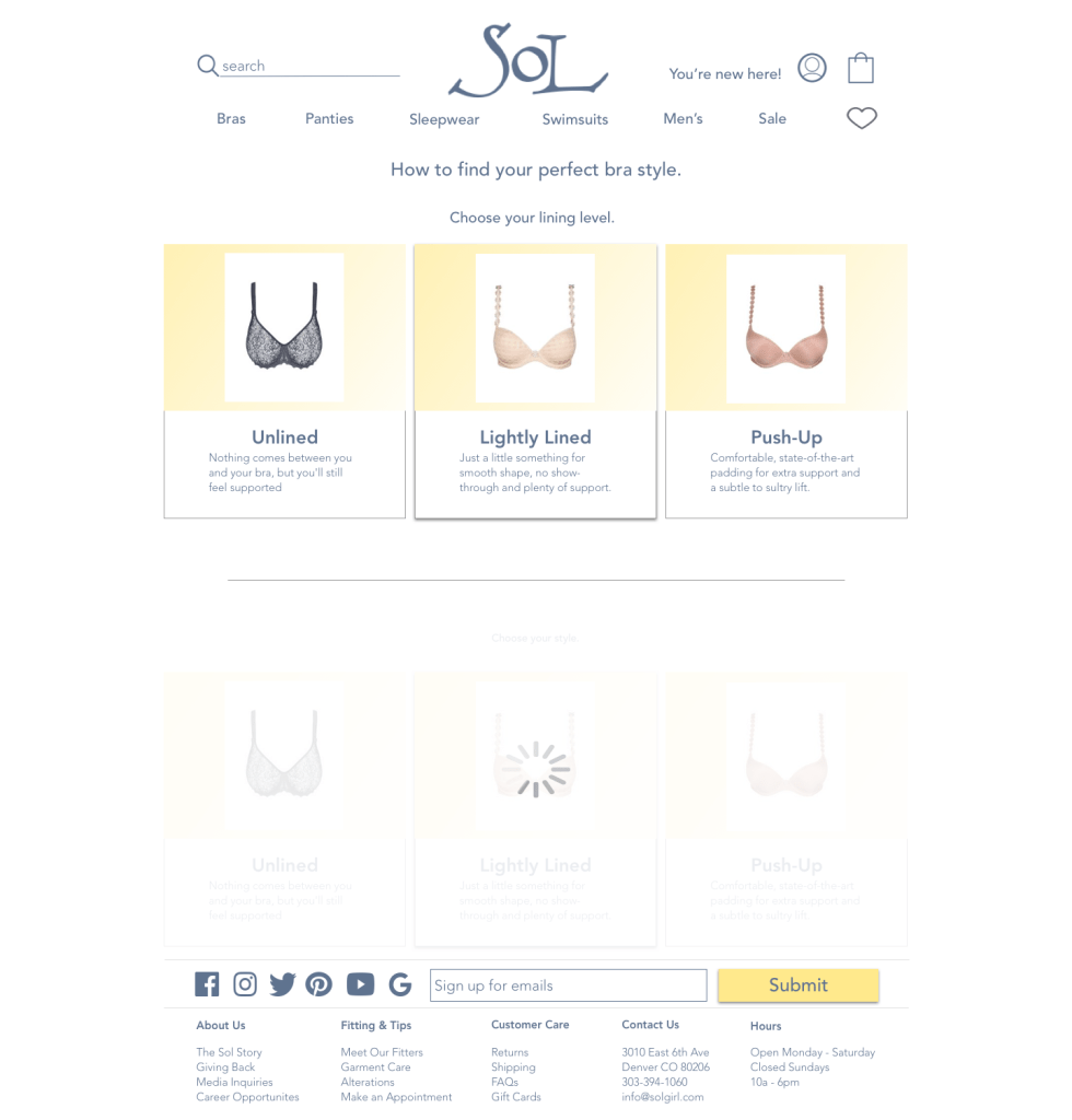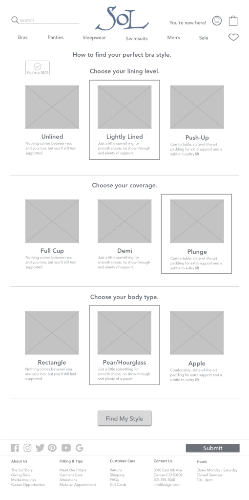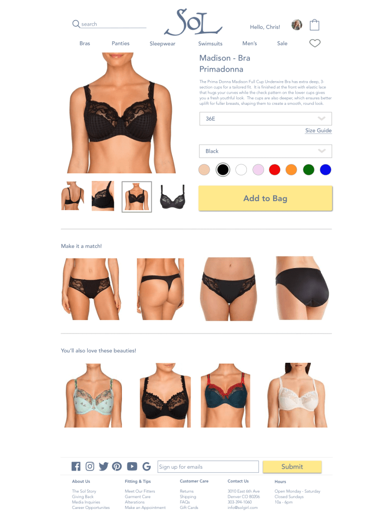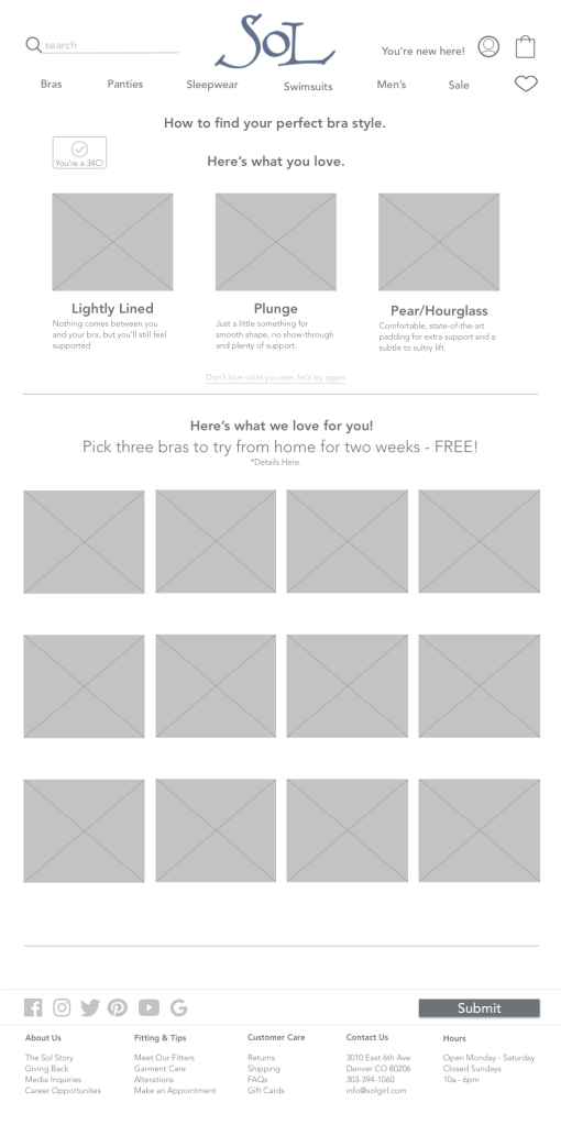 The current problem with the website is that it’s hard to find the product. And more importantly, it’s hard to find a specific product. Sol does an amazing job at cultivating strong customer relationships. They keep detailed notes on customer sizes, preferences, demographics, etc. So when a customer wants a new bra they can contact their sales person and the bra is sent directly to them. How can we convert the current (see below) website to simulate that similar concierge service customers have received in the store?