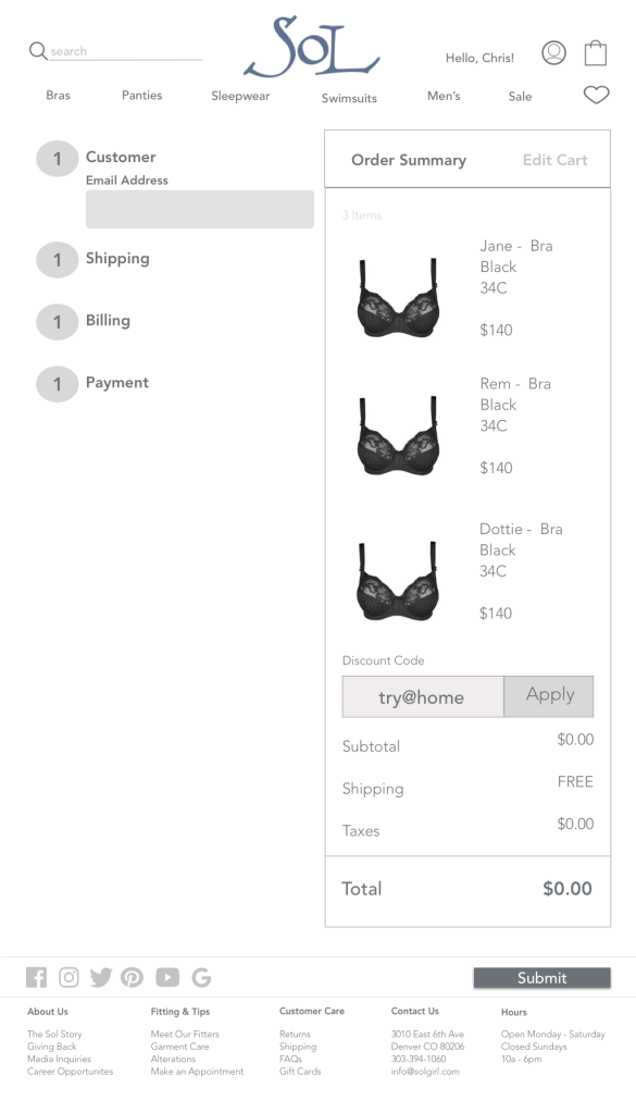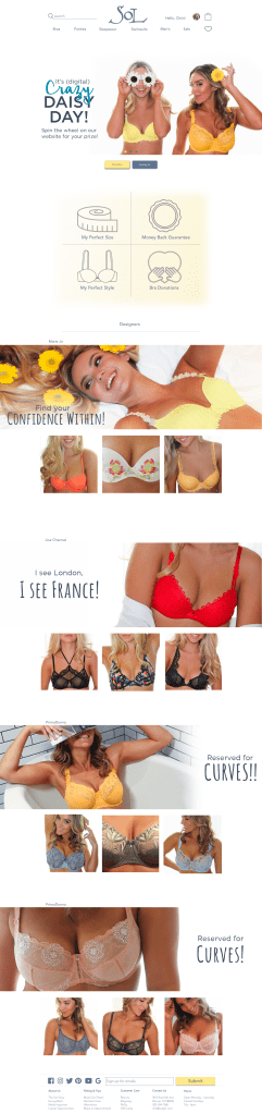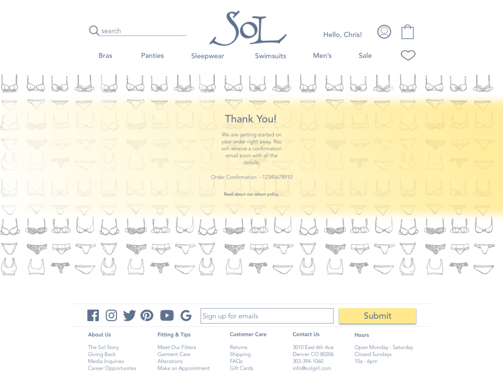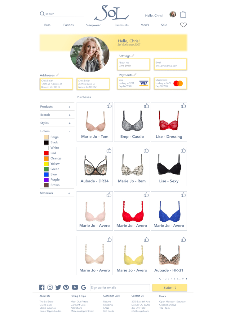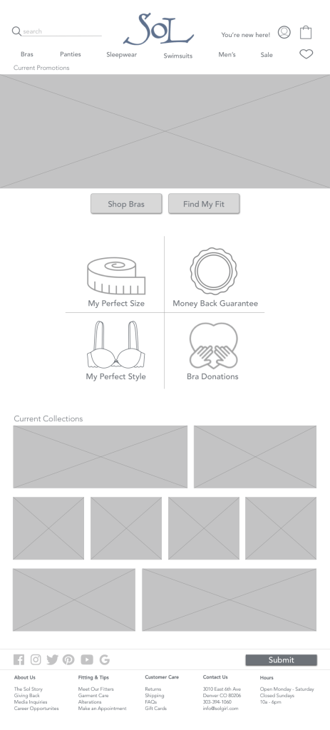 The current problem with the website is that it’s hard to find the product. And more importantly, it’s hard to find a specific product. Sol does an amazing job at cultivating strong customer relationships. They keep detailed notes on customer sizes, preferences, demographics, etc. So when a customer wants a new bra they can contact their sales person and the bra is sent directly to them. How can we convert the current (see below) website to simulate that similar concierge service customers have received in the store?